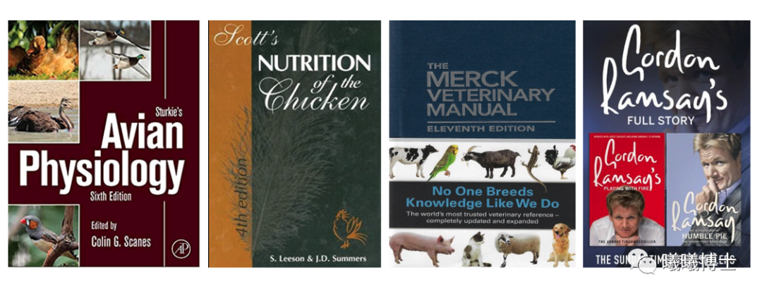 Avian Physiology 《鳥類生理學》(編輯:Colin G. Scanes)Scott's nutrition of the chicken 《家禽營養》(作者:S. Leeson & J. D. Summers)The Merck Veterinary Manual《默克獸醫手冊》(作者:Merck)非專業書籍: