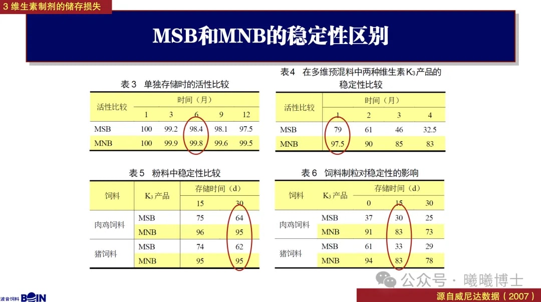 MSB和MNB在單獨儲存時,穩(wěn)定性相差還不大。但放到復合維生素里,差距就出來了。我們做過實驗,在四個月的時間跨度中,多維預混料中MSB的活性就遠低于MNB了(表4: 32.5% vs 83%)。將預混料用于全價飼料,無論是以粉料還是和顆粒料的形式,飼料放置15天和30天后,MSB活性都低于MNB(表5、表6)。