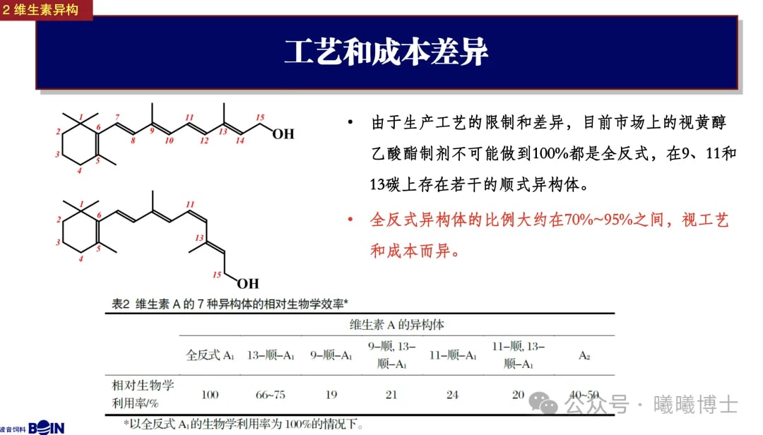 維生素A在9、11、13的碳上可能出現(xiàn)順式結構,而順式結構的生物效率遠遠低于反式結構(看下圖??)。全反式的維生素A生物利用率可能是100%,但有9-順的維生素A就只有19%了,差異巨大!然而,一般飼料企業(yè)使用的液相色譜儀對色譜柱的區(qū)分能力不足,很難分辨出順反式異構體,導致難以評估維生素試劑中有效的活性成分。